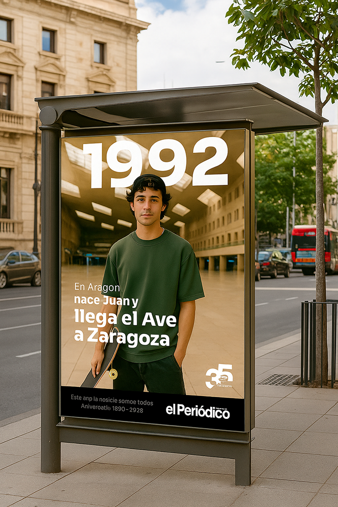 Cada pieza se presenta en gran formato, con el año como eje visual y un copy directo que vincula el nacimiento de la persona con el acontecimiento más relevante del año, rematado por el lema conmemorativo de los 35 años. El resultado es una serie cohesiva que se despliega en cartelería urbana, mupis, autobuses, páginas de periódico, redes sociales y un spot audiovisual que recorre los 35 años a modo de mosaico vivo.