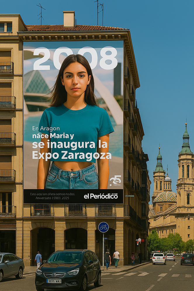 Para celebrar su 35 aniversario, proponemos a El Periódico de Aragón lanzar una acción que convierta la memoria colectiva en una historia compartida de presente y futuro. La campaña parte de un gesto sencillo pero poderoso: 35 retratos, uno por cada año desde 1990, protagonizados por personas nacidas en Aragón en ese mismo año. Cada fotografía se toma en localizaciones clave que dialogan con el titular de la noticia más significativa de ese momento, creando un vínculo entre la vida personal y la historia de la ciudad.