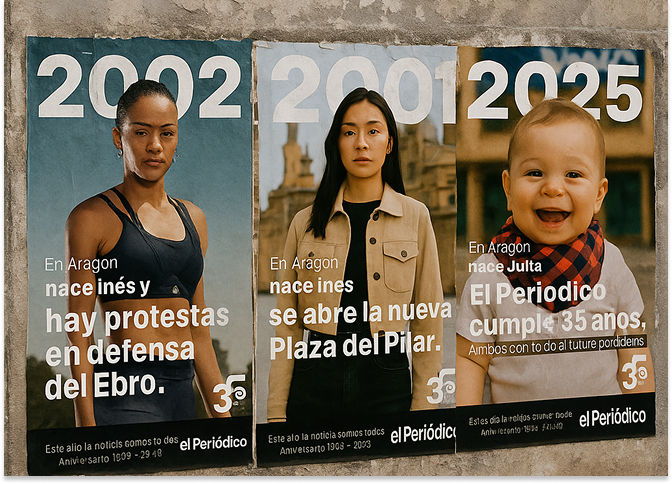 El Periódico de Aragón nos plantea el desafío de diseñar una campaña conmemorativa por su 35 aniversario que vaya más allá de la celebración institucional, conectando de forma real con los lectores actuales y potenciales, especialmente con un público joven que perciba al diario como un medio moderno, cercano y comprometido con el futuro de la región. El objetivo es poner en valor el papel del periódico como testigo de la vida aragonesa durante tres décadas y media, generando una narrativa que trascienda la nostalgia y se convierta en una celebración colectiva, fresca y urbana, capaz de adaptarse a diferentes formatos: prensa escrita, digital, exterior, audiovisual y redes sociales.